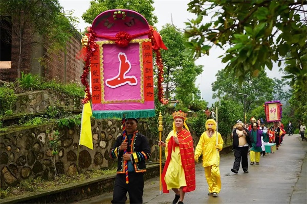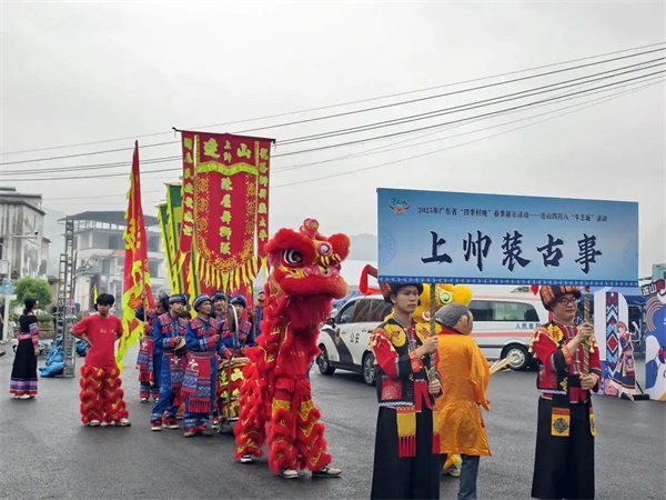 今年的“牛王诞”新增了“装古事”非遗巡游活动,这是壮族一种群众性民间游艺,已被列入清远市非物质文化遗产。巡游队伍从东君村出发,旌旗招展,锣鼓喧天。百余名群众演员扮演七仙女、西游记师徒、八仙等角色,手持竹篾灯具,演绎传统故事。